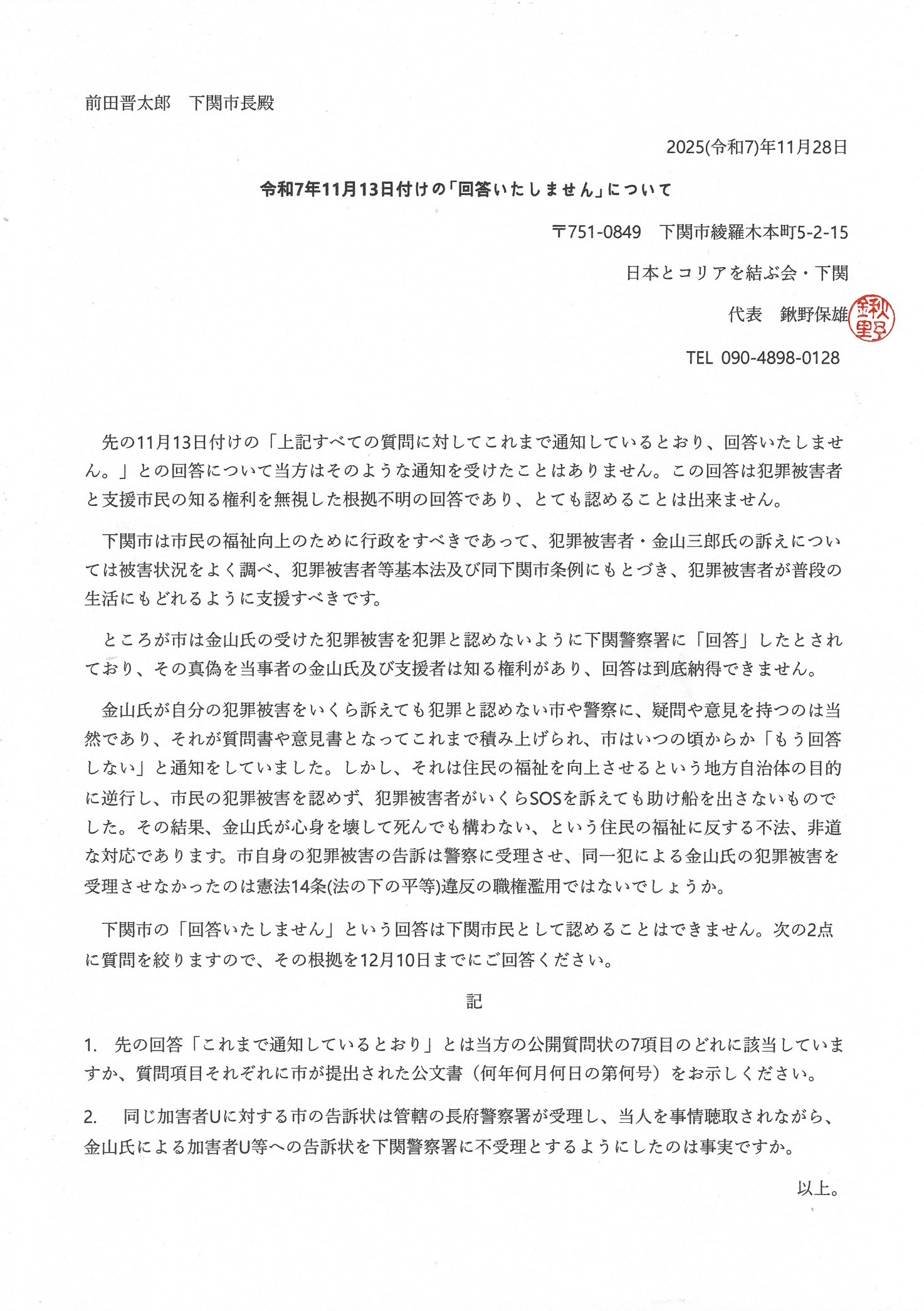下関市の回答があまりにもひどかったため、公開質問状第二弾を提出したそうです。
